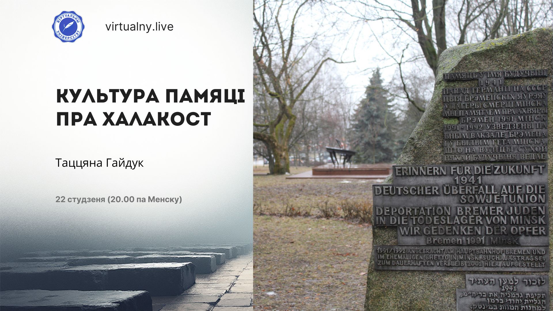 Падчас гэтага занятку вы адправіцеся ў віртуальнае падарожжа па месцах памяці, звязаных з Халакостам. На прыкладах з Беларусі, Польшчы і Нямеччыны вы ўбачыце розніцу ў культурах памяці.